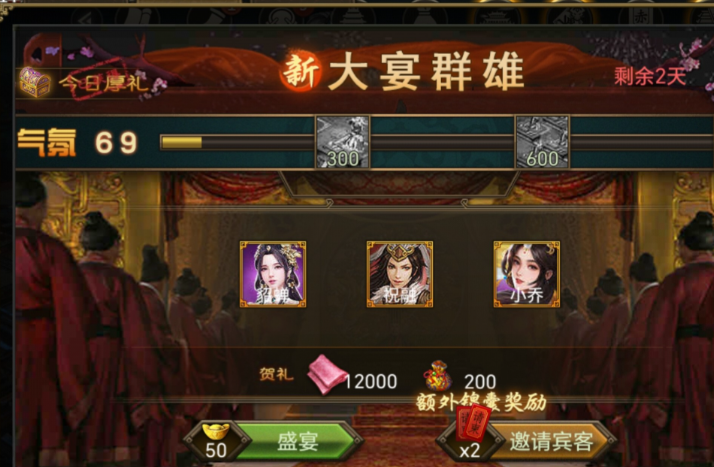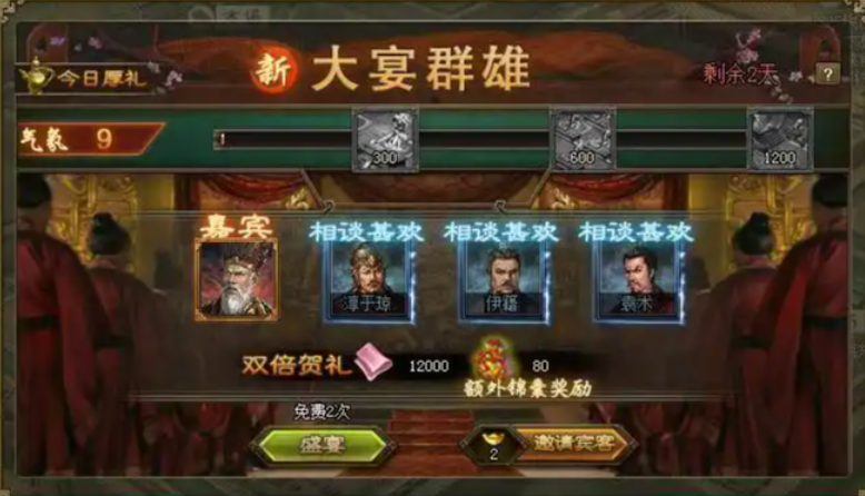 玩转大宴群雄活动,首先得知道怎么拿到请柬。每天系统会免费送两次盛宴机会,还能从功勋榜的箱子里领到请柬,如果不够用的话,可以用金币额外购买。拿到请柬后,直接点开活动界面,选择邀请宾客就能开始宴请武将了。每次邀请武将赴宴后,他们会喝酒并送你奖励,比如丝绸、锦囊之类的资源。如果运气好碰到神秘宾客,用盛宴邀请他们还能拿到更丰厚的奖励哦!