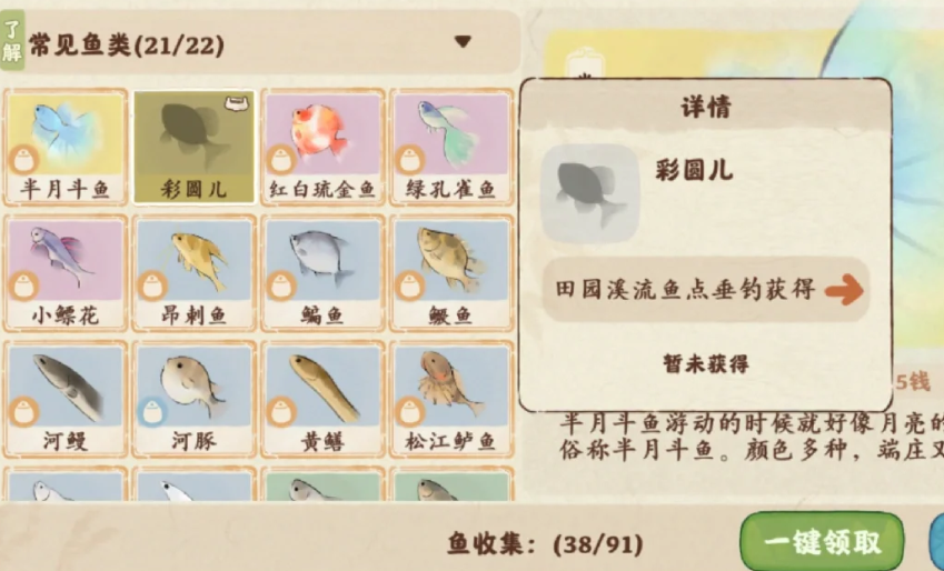 彩圆儿是桃源深处有人家中一种较为稀有的鱼类,主要分布在特定钓鱼点。根据游戏内设定,彩圆儿属于甲级鱼类,通常出现在家中河边、瀑布下以及南有乔木南边渡口等区域。不同钓鱼点的解锁等级和鱼类分布存在差异,玩家需根据自身等级选择合适的垂钓地点。