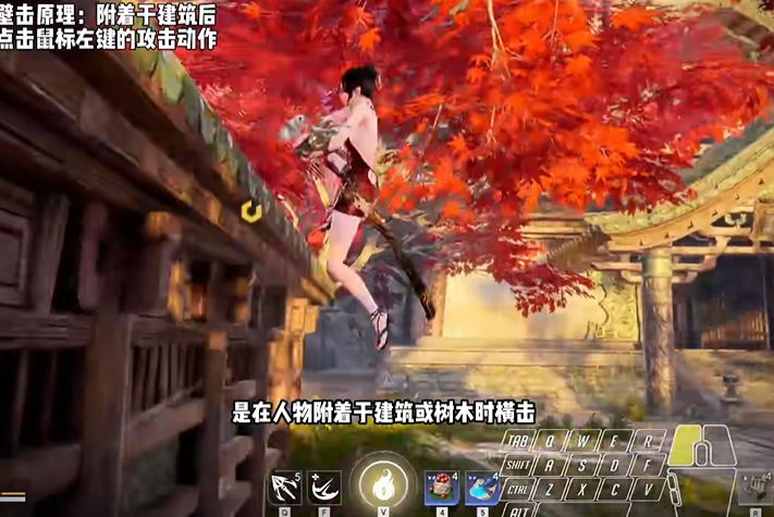 成功附着到墙面后,接下来就是释放壁击的关键步骤。在平面上使用壁击时,只需轻点平击按钮就能快速出招。但如果是在柱形建筑物上,则需要长按平击键才能触发,轻点会变成向正上方的冲顶攻击。需当角色处在树上或屋檐上时,不需要完全挂在上面就能直接触发壁击。这时候可以借助茂密的树木或复杂地形,等待敌人靠近后突然发动攻击,打对手一个措手不及。