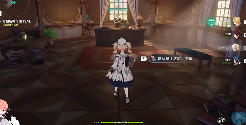 四处污渍的具体位置分布在大厅不同区域。第一处位于正门入口处,迪卢克角色站立位置附近的地毯边缘。第二处在进门左侧的小房间内,靠近书桌前方的地面。第三处污渍位于右侧休息区的沙发与地毯交界处。第四处需要直行至大厅深处的长桌后方,在桌脚与地面的接触点附近。所有污渍均呈现明显的白色痕迹,开启元素视野可辅助定位。