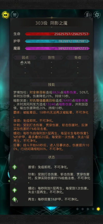 最终boss阴影之魇的难度比较高,生命值超过百万,护甲和魔盾也很厚,建议带上两个奶妈保持持续治疗,单奶和群奶都要有,活着才有输出嘛。它的技能包括单体暗影伤害和全体暗影伤害,还会附加恐惧效果降低输出,所以高频打断和持续治疗是关键。如果咱们的练度不够,可以先刷刷前面的层数提升装备和等级再来挑战。