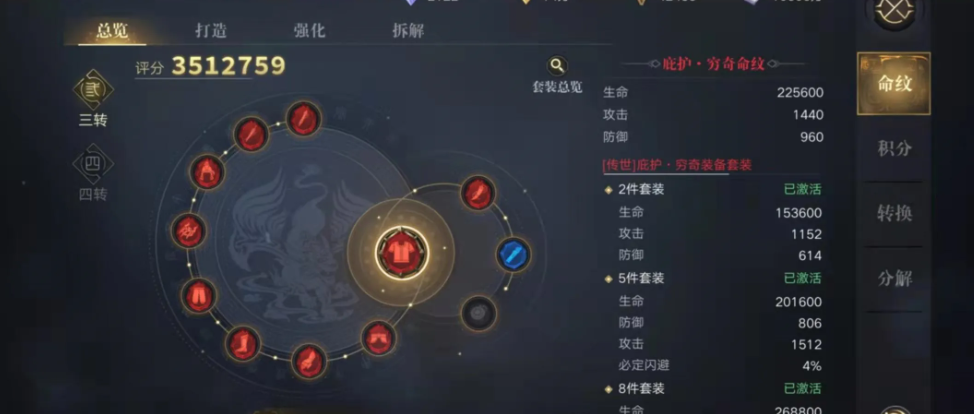 祈愿是获取高阶命纹结晶的核心途径,建议优先参与限时活动获取祈愿道具。每次祈愿会增加1点积分,积分可在商城内兑换血清、开光石等关键材料。若幸运值累积到一定数值,获得极品命纹后会被清零,因此需要合理规划祈愿次数。对于已经激活的低阶命纹,可以通过拆解功能全额返还材料,方便咱们重新调整搭配方案。