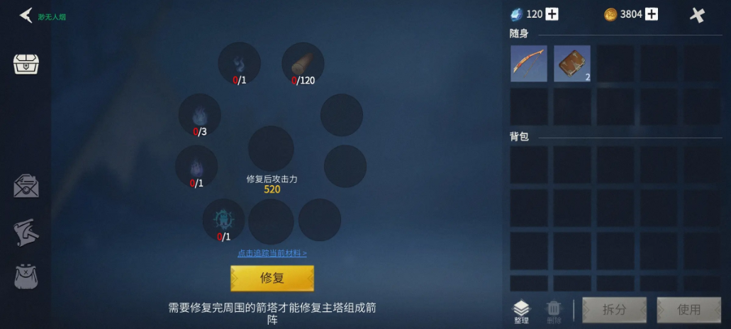 北方小镇难度明显提升,这里会出现烦人的弓箭手,建议用弓箭逐个勾引小怪慢慢打。箭塔修复材料比较贵,需要30铁杉木加1个灵魂,全图修复完得准备四百多铁杉木。近战怪用单手剑打两下走位一次,远程怪保持最远攻击距离,等它停下攻击就立刻跑开。祭坛位置在最后面左上方,修复后就能解锁苔原地图。