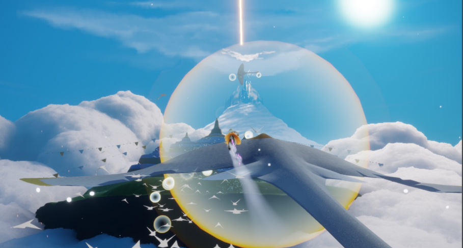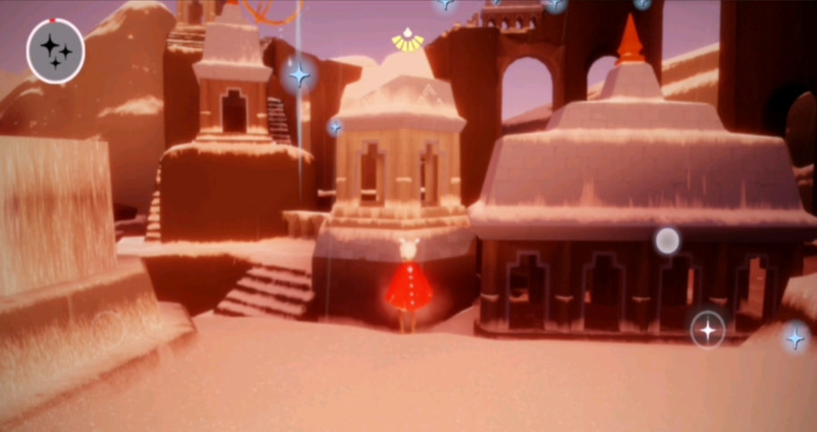 玩家可以优先在先祖左侧的亭子中间等待,此处会有三个蓝色星光自动飞过并完成收集。随后需要飞到入口上方的平台,在带有裂痕的位置等待两束星光飞过。接着移动到中间门洞区域,此处同样会有蓝色星光经过。最后前往最上方的金色球体左侧,完成剩余光点的收集。整个过程中,光点的飞行轨迹是固定的,因此耐心观察并预判飞行路径是提高效率的关键。