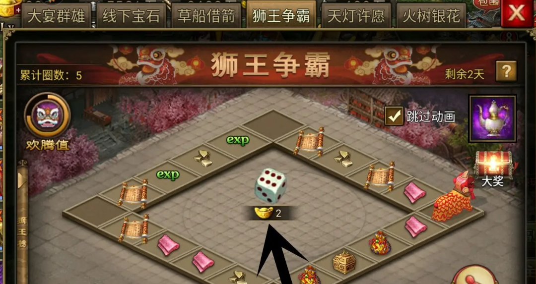 狮王争霸是攻城掠地中一个非常有趣的掷骰子玩法,每天有7次免费骰子机会,通过投掷骰子让醒狮在棋盘上前进,可以获得路径上的各种资源奖励。活动界面中央有个骰子按钮,点击就能让醒狮前进,右下角还有个鼓可以免费使用一次,能直接跳到下一个飞跃点获取大量资源。记得每天把免费次数用完,否则就亏大了。