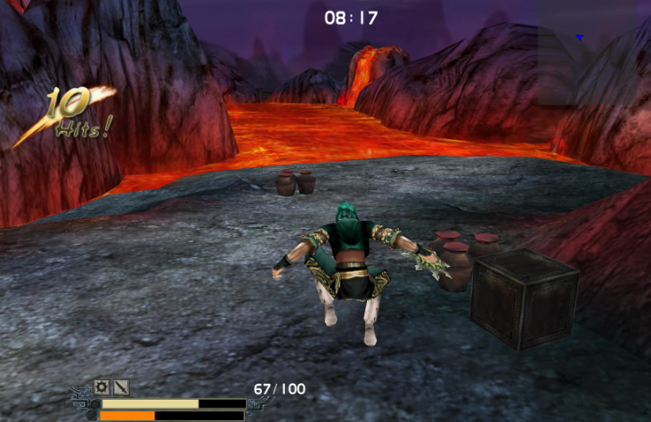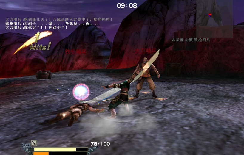 进入炎硫岛后,咱们会扮演孟星魂,任务是消灭所有敌人。开局手上有一把长剑,这是新手最友好的武器,连招简单且伤害不错。地图上有几个箱子,打破后能拿到飞轮和护甲,山坡底下还有匕首和包子,血量不足时可以吃包子回血。敌人只有两个,分别是大刀哨兵和铁枪哨兵,他们的攻击模式比较固定,用长剑的↑↑A↑↑A↓↑↑A连招就能轻松解决。如果刚开始不动手,等他们说完话,铁枪哨兵可能会自己跳进岩浆。