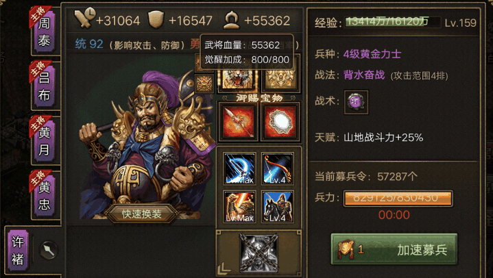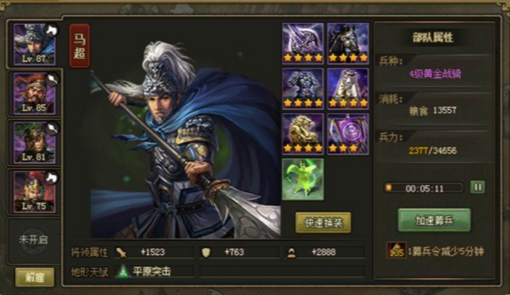装备分配上,许褚应穿戴战法攻击装,最大化其战法输出;典韦需配备强防或血量装以提升生存能力;马超则依赖强攻装备增强收割效率。若拥有魏延,可大幅降低难度,但其招募概率较低,因此不建议强求。朱雀套对许褚尤为重要,能显著提升其战法伤害;白虎套则适合典韦,增强其对抗能力。其他四星装备可根据实际情况灵活分配,但需确保兵器攻击力达标。