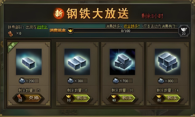 钢铁大酬宾活动是进阶获取途径,通过代金券可兑换百炼钢或铸造锤。前三名功勋榜玩家能获得额外代金券奖励,购买礼包次数与奖励质量呈正相关。存储钢铁时需注意时效性,避免锤子过期浪费,功勋箱子选择1600钢选项能最大化收益。祭祀系统同样提供炼钢机会,但需消耗特定资源进行祈祷。