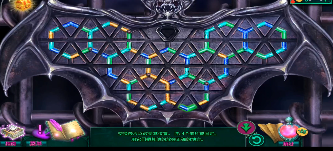 进入蝙蝠排列环节时,初始状态为固定嵌片与可移动嵌片混合。需按照颜色匹配原则逐步交换嵌片位置,重点观察固定嵌片与相邻嵌片的连接处颜色。例如最右侧嵌片需连接蓝色接口,左上部分需确保绿色衔接。每次点击可移动嵌片时,系统会高亮显示可交换区域,需优先处理与固定嵌片直接关联的嵌片。