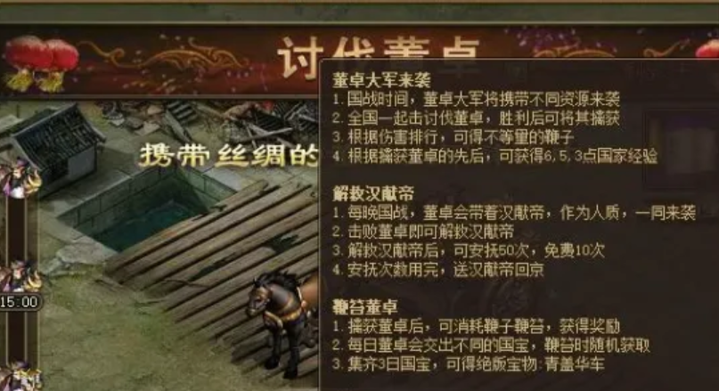 讨伐董卓活动中,汉献帝作为人质与董卓一同出现在主城旁的董卓营寨。玩家需先攻击董卓营寨获取鞭子道具,鞭笞董卓可触发资源掉落与狂怒状态,而安抚汉献帝则属于独立支线。活动重置时间为每日0点,包括鞭子获取次数、金币消耗及安抚次数均会刷新。需注意,鞭笞与安抚的奖励机制不同,前者依赖狂怒值爆发双倍收益,后者则直接通过交互获取固定资源。