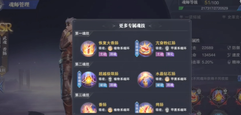 在魂环选择上,建议优先考虑提升生存能力的搭配,魔鬼果实、闪电珠、霸王花之泪和天罡护体这套装备既能保证血量又能增加攻击力。他的九个魂技各具特色,从恢复大香肠的身体痊愈效果,到解毒小腊肠的清除负面状态,再到飞行蘑菇肠的空中优势,每个技能都有不可替代的作用。特别是第六魂技复制镜像肠,这是他唯一具备直接作战能力的技能,使用时要特别注意时机。