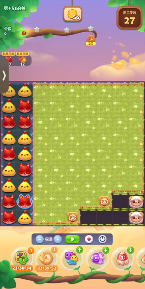 首先需要消除毛毛球、银币和小黄鸡,要在24步内完成目标主要难点在于有锁链的阻碍,玩家需要合理规划每一步来应对挑战。玩家要优先关注顶部区域的毛球和银币障碍,因为这些是早期的主要消除对象。黄色小鸡的消除则需要依靠染色宝宝来实现,所以在开局阶段就要注意观察和积累相关元素。