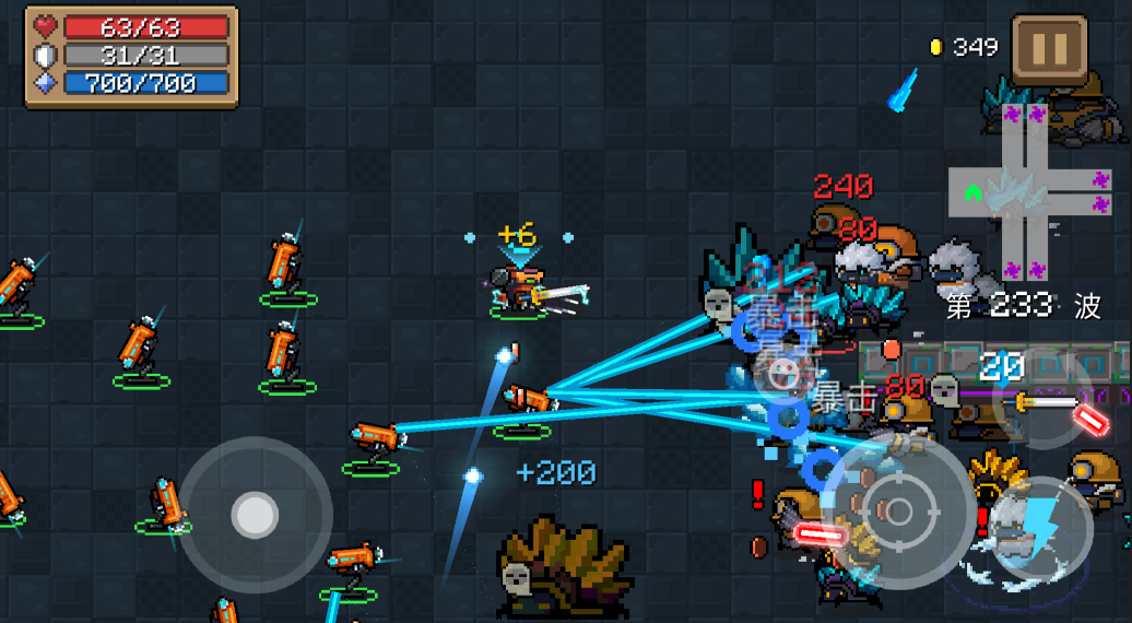 它和一技能不一样,主要功能不是打人,而是防守。你放下这个炮台后,它会自动拦截射向你的敌人子弹,为你清理出安全的移动空间。如果范围内没有子弹可拦截,它才会去攻击敌人,但攻击力比较低,频率也慢。这个技能在弹幕比较密集的关卡里能帮你很大的忙,尤其是对于走位还不够熟练的新手,相当于多了一道保险,让你有更多机会观察和反应。技能升到五星后,拦截的范围会变大,经过导师强化还能提升拦截和攻击的频率。虽然它的直接输出能力不如前两个技能,但在高压环境下提高生存率方面有独特价值。