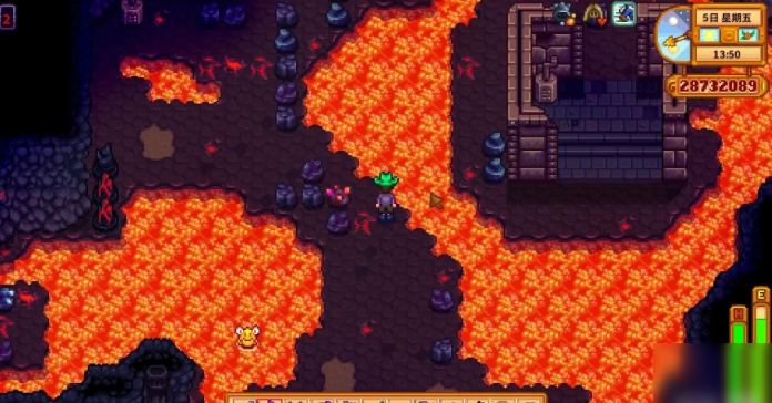 火山矿洞从第1层开始总共有10层,每5层会有一个矮人商店,第10层是顶层,那里有个锻造台可以附魔工具。矿洞里没有电梯或快捷楼梯,所以每次进去都得从第一层开始爬,一层一层往下走,运气好的话能找到近路。这里和普通矿洞不一样,里面有岩浆和各种怪物,比如黄色的火球和老虎史莱姆,它们会减慢你的速度,所以得小心点。你可以带上传送图腾,万一时间不够或者想快速回家就能直接用,不然矿洞里时间过得快,晕倒了会被送回去,白白浪费一天哦。矿洞里还有一些宝箱和机关,需要用水壶浇水凝固岩浆来开路,平时记得带个水壶进去,它就像通关的小帮手一样。