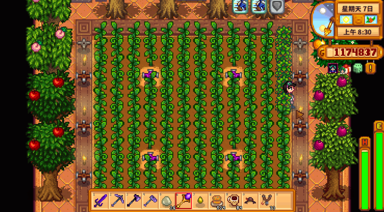 果树有一个超级厉害的特点,就是它的果子会树的年龄增长而自动升级品质。刚成熟的第一年,结的是普通果子;第二年就会变成银星品质;第三年金星;三年以后,就能稳定产出最顶级的铱星水果了!这个提升是自动的,你不需要做任何额外操作,只要保证树苗在生长时周围八格没有别的杂物(放个地板或者洒水器之类的会妨碍它长大)就行。这意味着你早期的每一笔果树投资,在未来几年里价值都会翻着跟头往上涨,一个铱星水果的价钱可能是普通水果的两倍还多。这绝对是长期经营农场的核心资产之一。