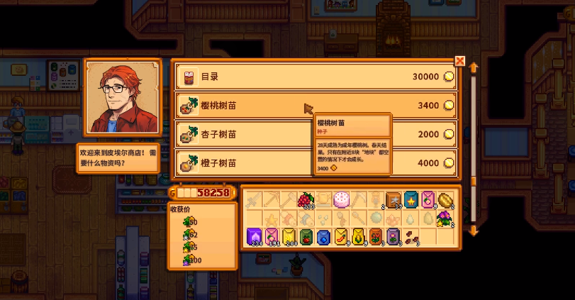 果树是个非常特别的投资,它和那些一年收好几次的农作物完全不是一回事。种果树是个放长线钓大鱼的事儿,你不能指望它像草莓那样快速回本。果树苗买来挺贵的,从皮埃尔的商店买齐不同种类得花上万多金币,但种下去它几乎就不用你操心了,不用浇水,冬天也不会冻死,你只需要给它足够的空间和时间。它需要整整28天才能长大,之后才会在对应的季节里每天给你结果子。所以刚开始玩的第一个月,你可能光投入看不见回报,但一旦它长成了,那就是一个相当稳定可靠的收入来源了,而且会跟着你的农场一起变老、变值钱。