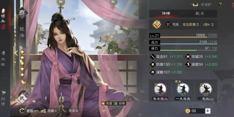 聊完了武将搭配,我们再看看战法和加点这些细节,这对开荒成功与否至关重要。战法经验要优先点满核心输出和恢复技能,比如马云禄的疾击其后和甄洛的洛水佳人应该优先保证等级。开荒讲究先手和爆发,所以马云禄带上先驱突击能在前两回合获得先手并增加普攻次数,性价比很高。甄洛作为辅助,她的谋略属性直接影响治疗量,所以加点一定要全谋略,这样才能让每次恢复的效果最大化。至于兵种转换,甄洛转弩兵可以获得伤害加成,转长弓兵则能获得先手优势,可以根据你队伍的总体需求来选择。
