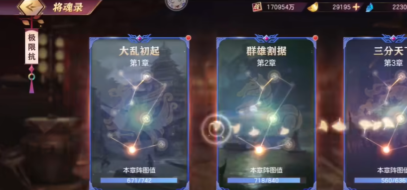 将魂录的阵图技能部分特别有意思,当你点亮足够数量的将魂后,比如阵图值达到30或60,就能激活不同的技能效果。比如说,大乱初起的技能能增加防御和反伤,让对手打你的时候自己也吃亏。群雄割据的技能是提供护盾和清除减益状态,能大大提升阵容的生存能力。三分天下的技能则着重在攻击力和怒气获取上,让你的输出武将们能更快放大招,清场效率高得很。这些技能升星后还能进一步提升效果,所以平时多积累将魂碎片很有必要。