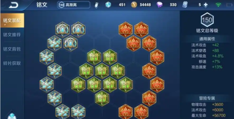 对于五级铭文的搭配,红色建议选择10个梦魇,提供法术攻击和法术穿透;蓝色可以用5个贪婪和5个狩猎的混合,增加法术吸血、移速和攻击速度;绿色则推荐10个心眼,进一步强化法术穿透和攻速。这套铭文的总属性包括法术攻击+42、法术穿透+88、法术吸血+9%、攻击速度+11%和移速+5%,这些属性覆盖了高渐离的核心需求,帮助他在前期对线不落下风,中期团战能稳定切入输出。法术攻击和穿透的组合确保他能快速击杀脆皮英雄,而吸血和移速则提升了生存和支援效率,让整体玩法更流畅。