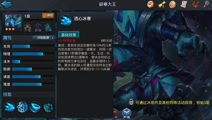 辟寒大王作为一位妖族战士英雄,以其强大的控制能力在战斗中扮演重要角色,他的技能设计围绕寒冰效果展开,能够通过冰冻和嘲讽来限制敌人的行动,为团队创造优势。在装备选择上,玩家们应该优先考虑提升他的生存能力和技能释放频率,因此推荐使用肉装并堆叠冷却缩减属性,这能让他更持久地站在前线并频繁释放技能。