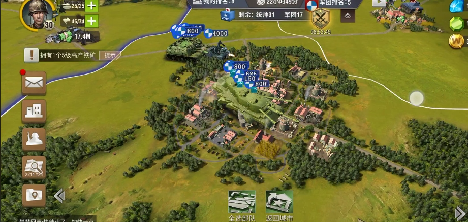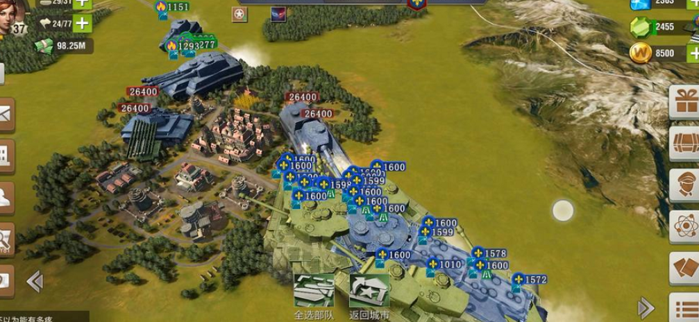 这种高级城市的守军火力非常猛,城市里布满了炮塔和大量高级反叛军部队,直接硬冲的话,就算你兵力不少也容易吃大亏,所以准备工作得做扎实了再说。第一步不是急着造兵,而是先把自己的城市发展起来,军事基地和兵工厂的等级一定要尽快提上去,因为只有高等级的基地才能解锁并建造那些更强力的攻城兵种,比如喀秋莎火箭炮、攻城炮这些大家伙,没有它们打高级城会非常吃力。同时战场等级也不能落下,多做主线任务能快速提升战场等级,这样你的部队编制人数上限会增加,意味着你一次性能带更多兵去打仗,这在攻打高级城市时是至关重要的兵力基础。