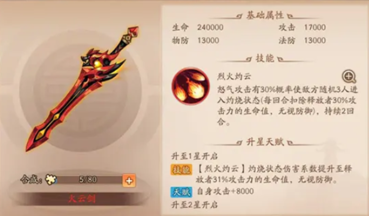 最适合他的神兵首选是火云剑。这把神兵的技能效果是,在角色进行怒气攻击时有概率对敌方随机三人施加灼烧状态,这个灼烧伤害无视敌方防御并能持续多个回合。这与陆逊自身的技能机制形成了完美联动,火云剑提供的额外灼烧效果能大幅提升陆逊的持续输出能力,让敌人在回合间持续掉血,完美契合了陆逊作为吴国灼烧流核心的定位。无论是追求极限输出还是组建灼烧阵容,火云剑都是陆逊最优先、最匹配的选择。