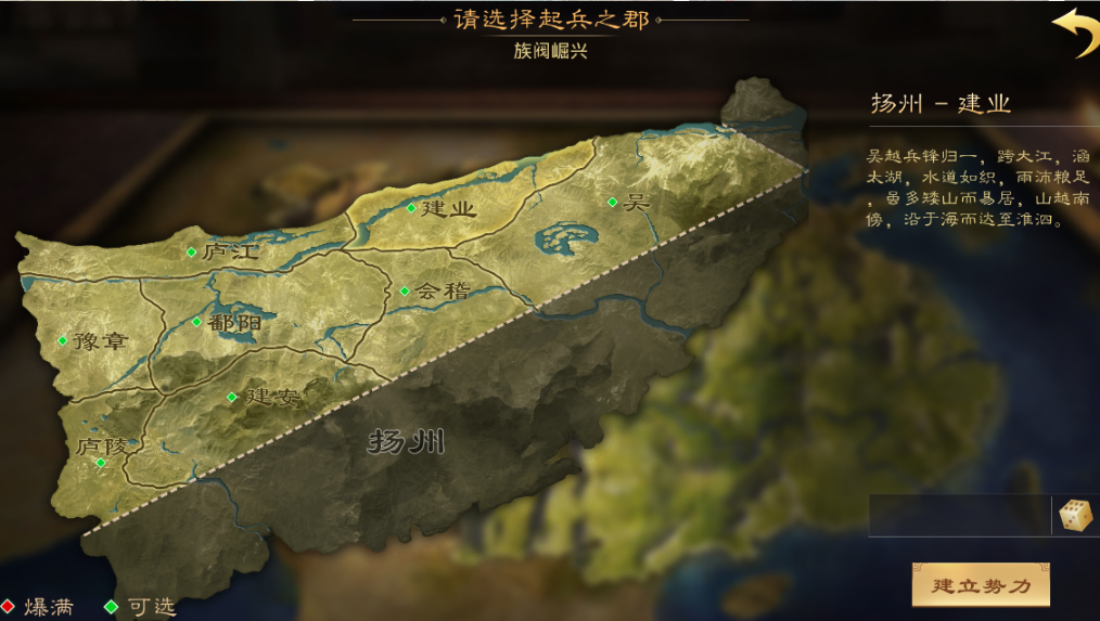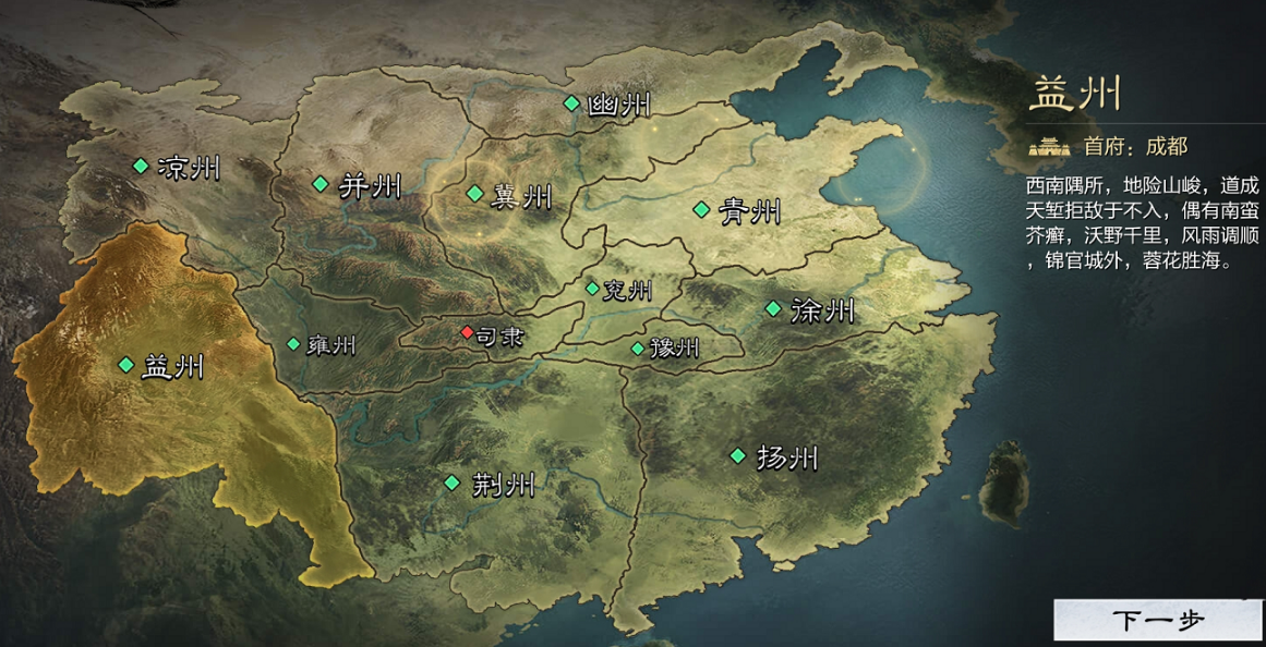 开局时玩家需要从九个州中选择一个作为出生地,这些可选州包括幽州、冀州、并州、凉州、青州、徐州、扬州、益州和荆州,而地图中央的四个州作为资源争夺区是不可选择的。出生地的选择看似简单,但实际上它会影响你整个游戏前期的节奏和发展方向,一个好的起点能让你在资源积累和势力扩张上事半功倍,虽然它并非决定性的因素,但确实能为新手玩家提供更顺畅的起步体验,毕竟不同州的资源分布和竞争程度各有特点。