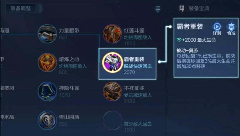 到了游戏中后期,我们需要进一步强化亚瑟的反伤和续航能力。反伤刺甲是一件攻守兼备的装备,提供高额的物理防御,其被动能将受到的物理伤害以法术伤害形式部分反弹给攻击者,这让切你的刺客和射手自己也会掉不少血,不敢肆意对你输出。最后一件装备,霸者重装,则是将打不死的续航能力推向极致,它提供巨额的最大生命值,并且被动效果让你在脱离战斗后能高速回复生命,配合亚瑟自身的被动回血,打完一波团战撤出来兜一圈,血量又回上来了,可以迅速重返战场,给对手造成持续的压力。