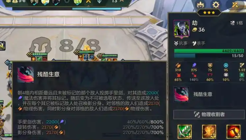 游戏前期,如果你决定要玩这套,可以考虑适当地连败来优先拿到自己想要的装备,但也要注意保持血量健康。一般在3-1或3-2回合左右升到6级,然后稍微花点钱搜一下,目标是找到劫和凑齐6决斗大师的基础阵容,这时候如果质量够了就很容易开始连胜。到了4-1回合左右升到7级,这时候要全力找到一张劫,只要劫来了并且有合适的装备,阵容的战斗力就会有质的飞跃,可以稳定血量和经济。之后可以考虑存钱上8级,在8级时把劫搜到两星,并且补充其他五费卡来提升阵容的上限。