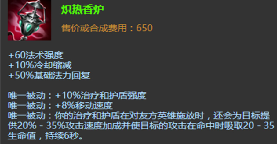 第一件成型的大装备,绝大多数情况下都会选择炽热香炉。这件装备对露璐来说简直是天作之合,因为它提供的属性——法术强度、技能急速和法力回复——都是璐璐非常需要的,更重要的是它的被动效果。你的护盾或治疗技能命中队友时,会为他们提供攻击速度和额外的魔法伤害,这对于你保护的射手来说是个巨大的提升,能让他们的普攻像开了小马达一样又痛又快。出了香炉之后,你会发现你家射手的对拼能力明显上了一个档次,很多时候对面拼着拼着就发现打不过了,这就是香炉的威力。