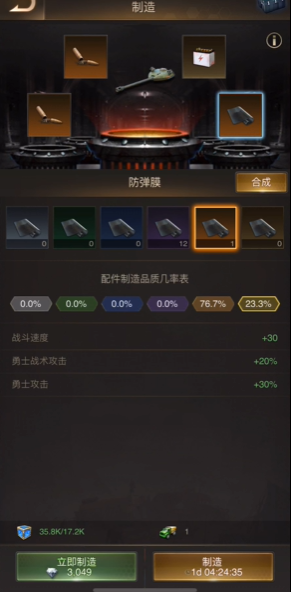 合成金色配件需要准备4个相同的橙色配件作为基础材料,这些材料可以在游戏的合成界面中使用。橙色配件本身也是高级装备,需要通过积累低级配件一步步升级获得,整个过程需要你有足够的耐心去收集和尝试。