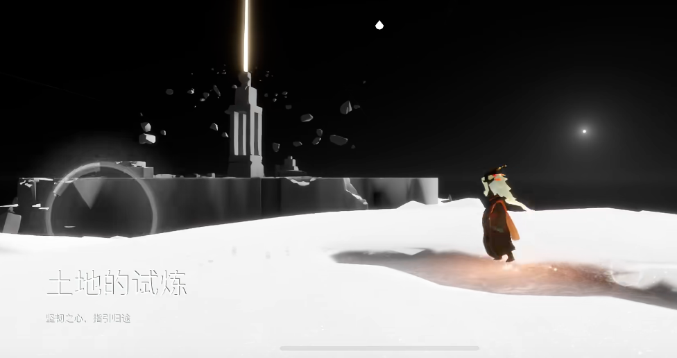 你会来到一个比较开阔但也很暗的区域,这里需要你点燃最后的机关。这时候贴着左边的墙壁慢慢摸索前进,往往就能找到通往终点的路。成功到达终点平台后,记得去点燃那个发光的先知石像,进行打坐。完成打坐后,你就会获得一段时间的金色保护状态,这时候再绕到石像后面的台阶上,就能拿到这个试炼的光翼奖励了。