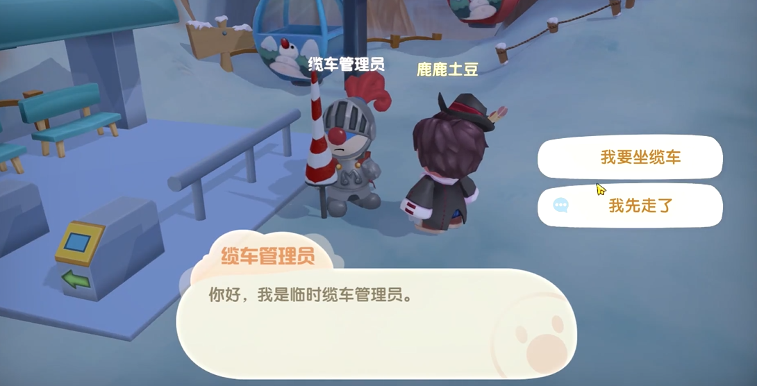 在准备乘坐前,最好检查一下自己的装备,因为雪山区域气温比较低,虽然游戏里可能没有严格的健康值设定,但提前做好探险准备总是好的。和NPC杰西对话选择乘坐后,缆车就会缓缓启动。这里要特别提醒你,缆车行进的速度其实比走路快不了多少,整个过程会比较缓慢,需要你有点耐心。在缆车移动的过程中,你会被带着缓缓上升,沿途可以欣赏到非常漂亮的雪山全景,像山腰的小木屋、神秘的图腾柱这些景色都能一一掠过。不过注意啦,在乘坐过程中你暂时不能进行其他操作,只能安静地欣赏风景,直到缆车到达山顶的目的地。