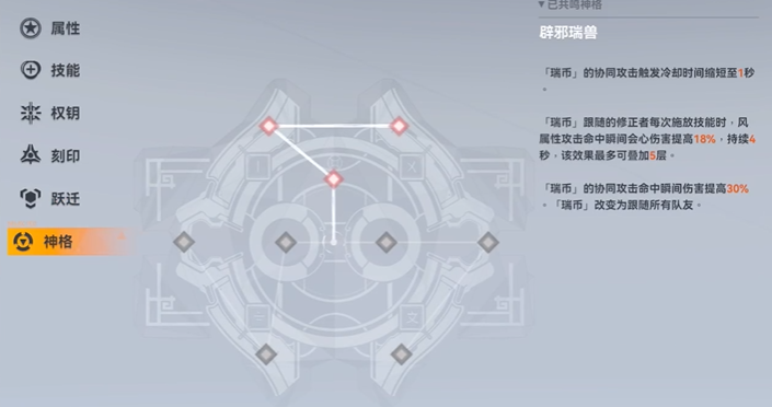 需要根据她的辅助定位来规划资源。权钥方面,若有充裕资源则强烈推荐抽取其专属钥从以最大化辅助能力,若资源有限,使用四星破甲权钥作为过渡也是可行的选择。刻印搭配上,主流辅助配装通常选择金玉百解与屠龙的套装组合。神格路线的选择则直接决定了她的玩法侧重,红色中线是强化辅助能力的常规选择,而蓝色左线或黄色右线则分别偏向输出或副C定位,这需要根据队伍具体的输出缺口来调整。跃迁系统的加点也应服务于辅助职能,优先考虑提升奥义等级、增加印记获取或选择无尽构筑等强化团队循环的选项。