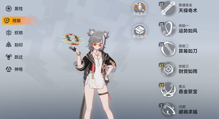 百解·禄良的技能组设计使其在辅助层面功能明确。一技能是快速的滑行攻击,二技能掷出神算子进行远程打击,而核心的三技能辟邪奇术可在释放普攻最后一段或特定技能后衔接使用,并根据消耗的财运点数,在释放财货如雨时按比例提高全队伍的风属性伤害。她的奥义吞金聚宝能生成一个跟随自身或队友的瑞币,此瑞币不仅能使跟随者的风属性攻击命中瞬间伤害提高,还能触发协同攻击并短暂聚集敌人,同时对命中的敌人附加风属性抗性降低的效果,这一套组合机制奠定了她作为风队专辅的地位。