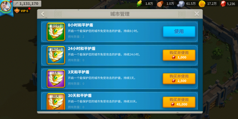 除了靠打架破盾,另外一个核心思路就是等待。游戏里除了新手盾,还有各种各样你主动使用的护盾道具,比如8小时、24小时甚至3天的和平护盾。这些道具用上去之后,会形成一个更强的保护,这时候你再去打野或者攻击别人,这个道具产生的护盾是不会消失的,它会持续到时间用完为止。对于这种护盾,你是没办法主动提前卸掉的,只能等它的持续时间自然结束。在用这些高级护盾之前一定要想清楚,别在需要集结盟友打架的时候发现自己被自己套的盾关在了城里。你需要做的就是在增益效果列表里看好护盾的剩余时间,算好自己下一次可能行动的时间点。