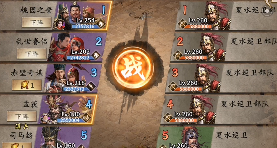 副本的核心挑战在于应对敌人极高的战法爆发。敌人配置为五车和方圆阵,战法万箭齐发能造成四排高额伤害,因此优先选择具备抗伤或反制能力的武将是关键,例如利用觉醒技能或护盾来抵消敌方战法的第一波攻势。战车克制与阵法联动在此阶段尤为重要,通过战车互破来削弱敌人是常见的突破口。