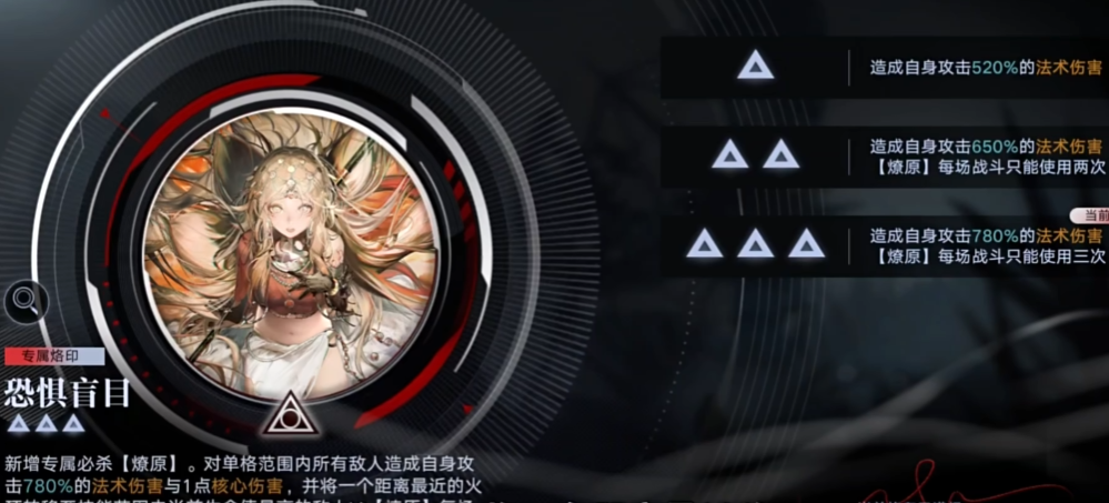 赫斯提亚的枷锁提升显著,其中一枷锁和三枷锁是关键质变点,能大幅优化手感并提升伤害上限,若计划在深阱、主线等高难环境中让她担当主力,则值得考虑获取。她的专属烙印也提供了重要的机制补强或伤害提升选项。在烙印搭配上,应选择能强化其持续作战与技能释放频率的套装,以最大化其挂燃烧和触发被动的能力。