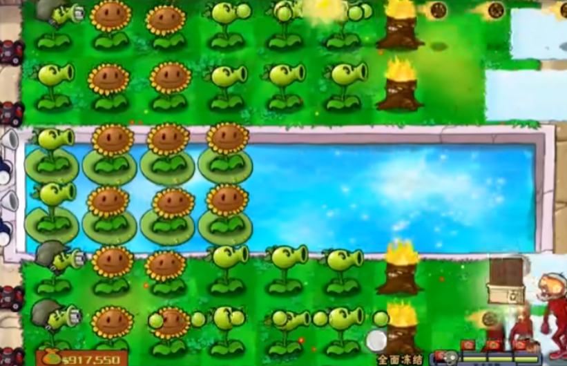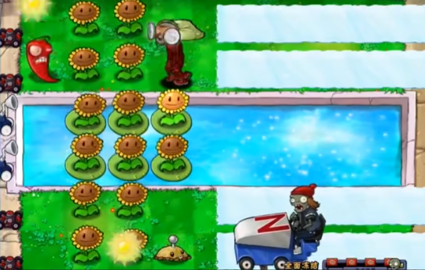 开局阶段必须优先保证阳光供应,为后续的防御布局奠定资源基础。游戏开始后,应立即在场地后方安全区域种植至少两排向日葵以快速积累阳光。当最早的一两个僵尸出现时,应直接使用窝瓜或土豆地雷解决它们,目的是保护向日葵不受干扰,确保经济循环的顺畅建立。早期遇到的雪橇车僵尸也可以直接用窝瓜处理。水路区域在初期可以放置水草来暂时应对僵尸,无需过度消耗资源。