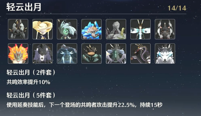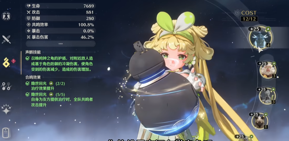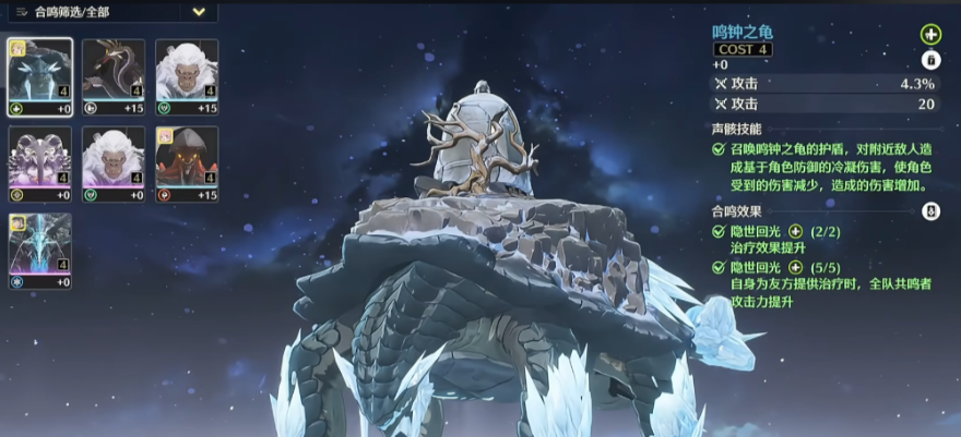 除了技能自带的伤害提升外,鸣钟之龟作为COST值为4的高价值声骸,其战略意义更在于激活强力的合鸣套装效果。它通常被用来凑齐隐世回光或轻云出月这两种合鸣套装。隐世回光套装的两件套效果可直接提升治疗效果,而四件套效果能在治疗队友时提升全队的攻击力,这对于依赖攻击力进行输出的队伍而言是显著的间接伤害增幅。携带鸣钟之龟的角色,其提供的伤害加成往往是技能直接增伤与套装团队增益相结合的结果。