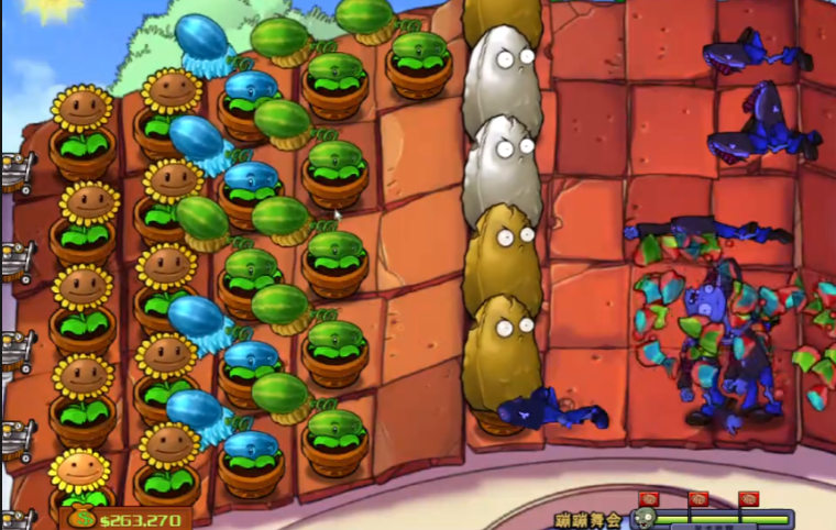 防线成型阶段在最前排种植高坚果,作为物理拦截屏障,即便磁力菇未及时生效,蹦蹦僵尸撞击高坚果后也会损毁弹跳杆,双重克制机制大幅提升稳定性。高坚果外侧可套上南瓜头盔,延长防御耐久,应对持续啃食。中排区域布置西瓜投手或冰西瓜投手,利用范围伤害清理成群僵尸,冰西瓜还能减速无弹跳杆的僵尸,配合多重豌豆射手补充单点伤害,形成持续输出火力,避免僵尸堆积压垮防线。
