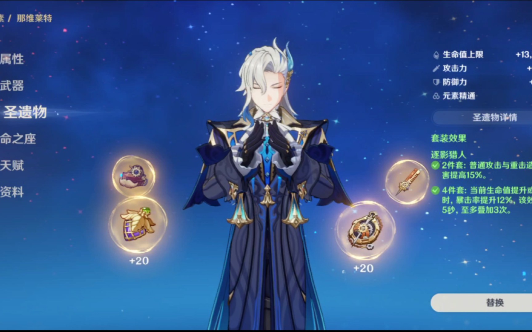 对于资源有限的玩家,活动赠送的无垠蔚蓝之歌也是不错的选择,充能词条能缓解循环压力,同时提升重击伤害。常驻池的流浪乐章虽然爆发期伤害可观,但真空期长且随机性大,更适合速切玩法。其他五星法器如四风原典或碧落之珑也能用,但机制适配度一般,优先级不如专武和下位替代。圣遗物方面建议搭配逐影猎人4件套,利用生命值变动快速叠满暴击率,副词条优先双暴和生命值,杯子推荐水伤或生命主词条。