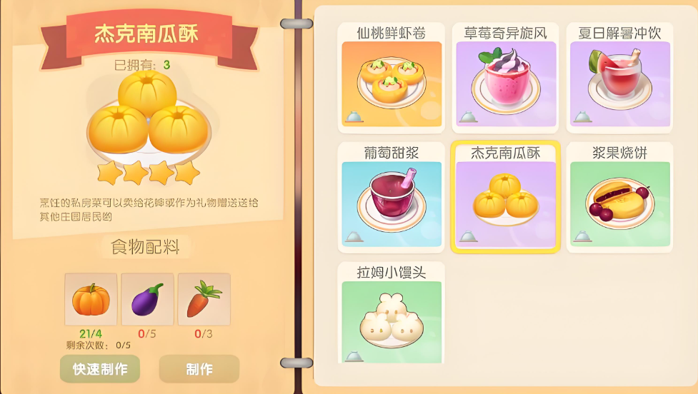 杰克南瓜酥是一道四星稀有度的甜点料理,主料为南瓜,辅料需茄子与胡萝卜。制作该料理需厨师等级达到6级解锁食谱,基础配方为南瓜4、茄子5、胡萝卜3,火候选择中火。食材可通过梅森种子商店购买对应种子,在农场种植后获得。南瓜种子需2级商店花费6摩尔豆购买,胡萝卜与茄子种子同样需通过梅森商店获取,而小麦作为可选辅料需32级解锁种子购买权限。
