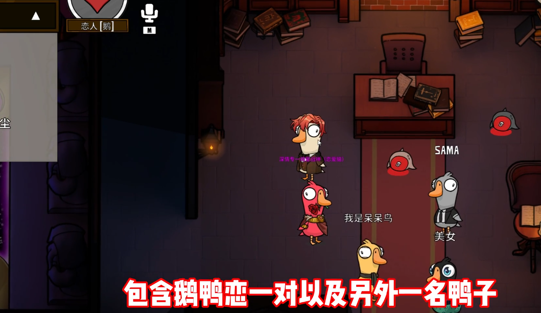 鹅鸭恋是一种特殊的恋人关系组合,由一名鹅阵营玩家和一名鸭阵营玩家绑定而成。他们的胜利条件较为复杂,既可以选择跟随各自阵营的常规胜利方式,也可以作为独立的第三方阵营争取恋人专属胜利。恋人专属胜利的条件是双方存活至游戏最后阶段,且场上仅剩三人时触发判定,若第三名玩家不具备击杀能力(如不带刀的中立角色),恋人即可共同获胜。这一胜利方式对双方的生存能力和默契配合要求极高,通常需要规避常规阵营冲突并巧妙利用游戏机制。