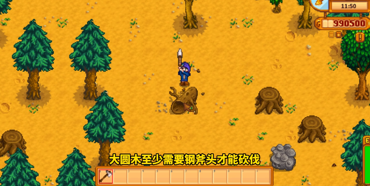 铜斧可以砍伐农场内的大树桩,而钢斧能劈开阻挡秘密森林入口的枯树干。升级斧头需要收集铁锭和金币,建议优先完成这一步骤。秘密森林位于农场下方煤矿森林的左上角,入口被枯树干阻挡,需用钢斧清除。进入后,森林内有6个固定刷新的大树桩,每日可提供稳定硬木来源。