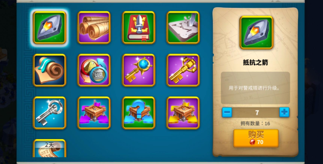 宝石购买适合应急补充,单价10宝石/个。建议仅在缺口较小时使用,优先通过每日任务和活动积累免费宝石。VIP特权礼包包含大量抵抗之箭,但需衡量性价比。注意警戒塔升级存在阶段性需求,不必过早囤积过量材料,避免资源闲置。