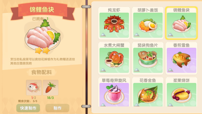 钓到锦鲤后,可将其用于烹饪料理,例如锦鲤鱼块或石榴炸虾。制作锦鲤鱼块需靠近厨房烹饪区,选中对应菜谱并消耗半小时完成烹饪。石榴炸虾需准备虾仁、石榴籽等食材,通过腌制、炸制等步骤制作。部分料理需特定鱼类作为原料,因此合理储备鲢鱼有助于高效完成烹饪任务。
