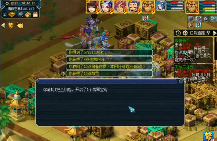 钥匙获取效率与奖励兑换策略也会间接影响完成度。银钥匙通过击杀秽气妖等普通怪物概率获得,金钥匙则来自三才阵、阵眼等特殊战斗。合理规划钥匙使用顺序,优先开启翡翠宝箱和金宝箱能最大化收益。在迷宫后期,及时参与上古化蛇挑战和五彩宝箱争夺可进一步提升贡献度。个人贡献达到80点以上可在活动结束后领取额外奖励。