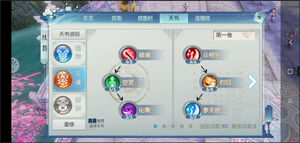 绝影的主动技能分三系,重点加满闻恶声、狂烬、祭魂生威这三个输出技能,显妖心前期可点满辅助清怪,后期酌情调整。生存类技能优先朝生暮死和神魔判,镇狱伏邪点1级即可。天书选择主潜影或灭魂,前者强化续航,后者提升爆发,根据你的战斗场景灵活切换。