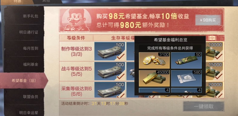 首先得了解它的基本机制。希望基金是游戏内性价比极高的氪金项目,购买后可以根据庄园等级逐步解锁奖励,包括新币、联盟信用点、配方残页等实用资源。无论你是新手还是老玩家,只要购买基金,之前未领取的低等级奖励也能一次性补领,不用担心错过。冲基金前建议先确认自己的庄园等级,因为奖励会随着等级提升逐步发放,等级越高拿到的资源越多。